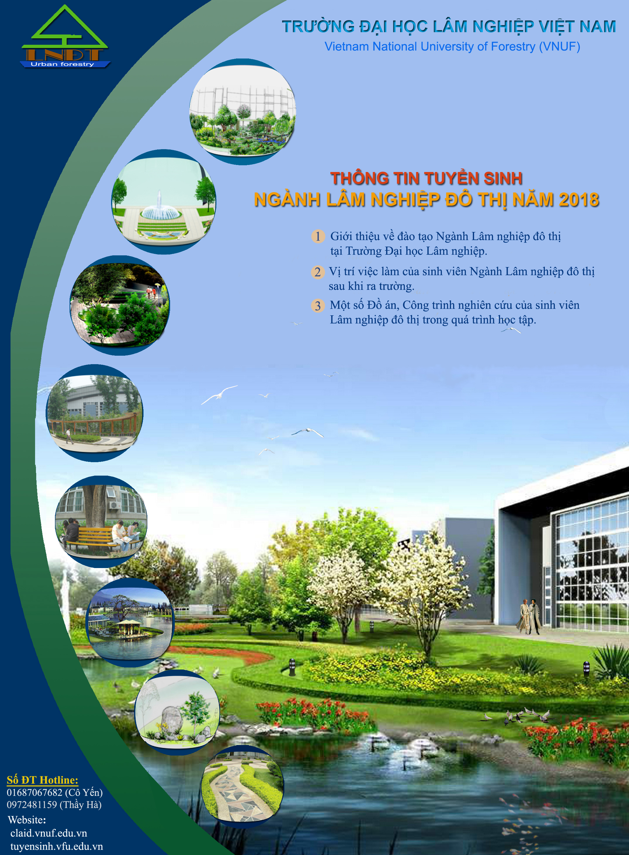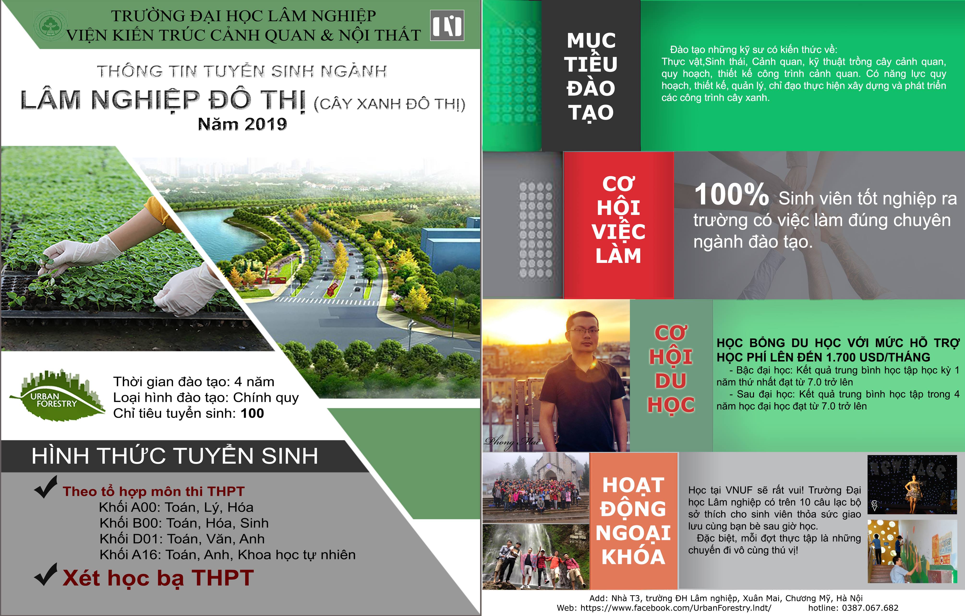 Đọc tiếpTrường Đại học Lâm nghiệp là trường đại học đầu tiên trong cả nước được Bộ Giáo dục và Đào tạo cho phép tuyển sinh đào ngành Lâm nghiệp đô thị ở bậc đại học (2001) và đến nay đã có 18 khóa tốt nghiệp ra trường. Năm 2017, Trường Đại học Lâm nghiệp Tuyển sinh 50 chỉ tiêu sinh viên ngành Lâm nghiệp đô thị. Trong đó tuyển Theo tổ hợp môn thi THPT: Khối A00: Toán, Lý, Hóa; Khối B00: Toán, Hóa học, Sinh học Khối D01: Toán, Văn, Anh; Khối A17: Toán, Lý, Khoa học tự nhiên và Xét học bạ THPT.
